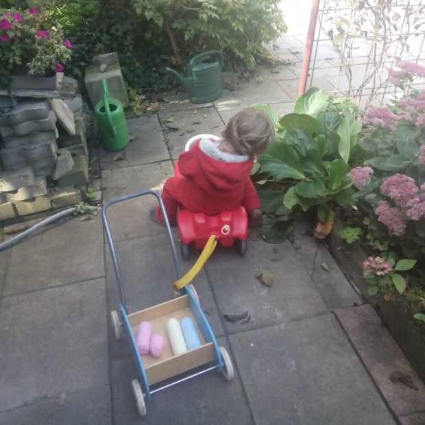 Die beiden Mädels die hier mit glitzerndem Geschenkband dafür gesorgt haben, dass der Teddy im Anhänger hinter dem Bobbycar herkommt, waren zu Mayas Geburtstag nicht dabei, sondern hatten offenbar selbst eine ähnliche Idee.